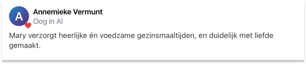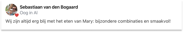 “Hai Mary, ik wilde je graag even laten weten hoe erg we van jouw kookkunst hebben genoten, de kids en ook wij hebben er zo van gesmuld! Wat stop je er toch altijd veel liefde in 💕”